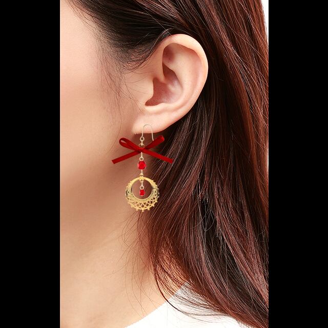 赤いサテンリボンとゴールドのモチーフが華やかなピアスです!